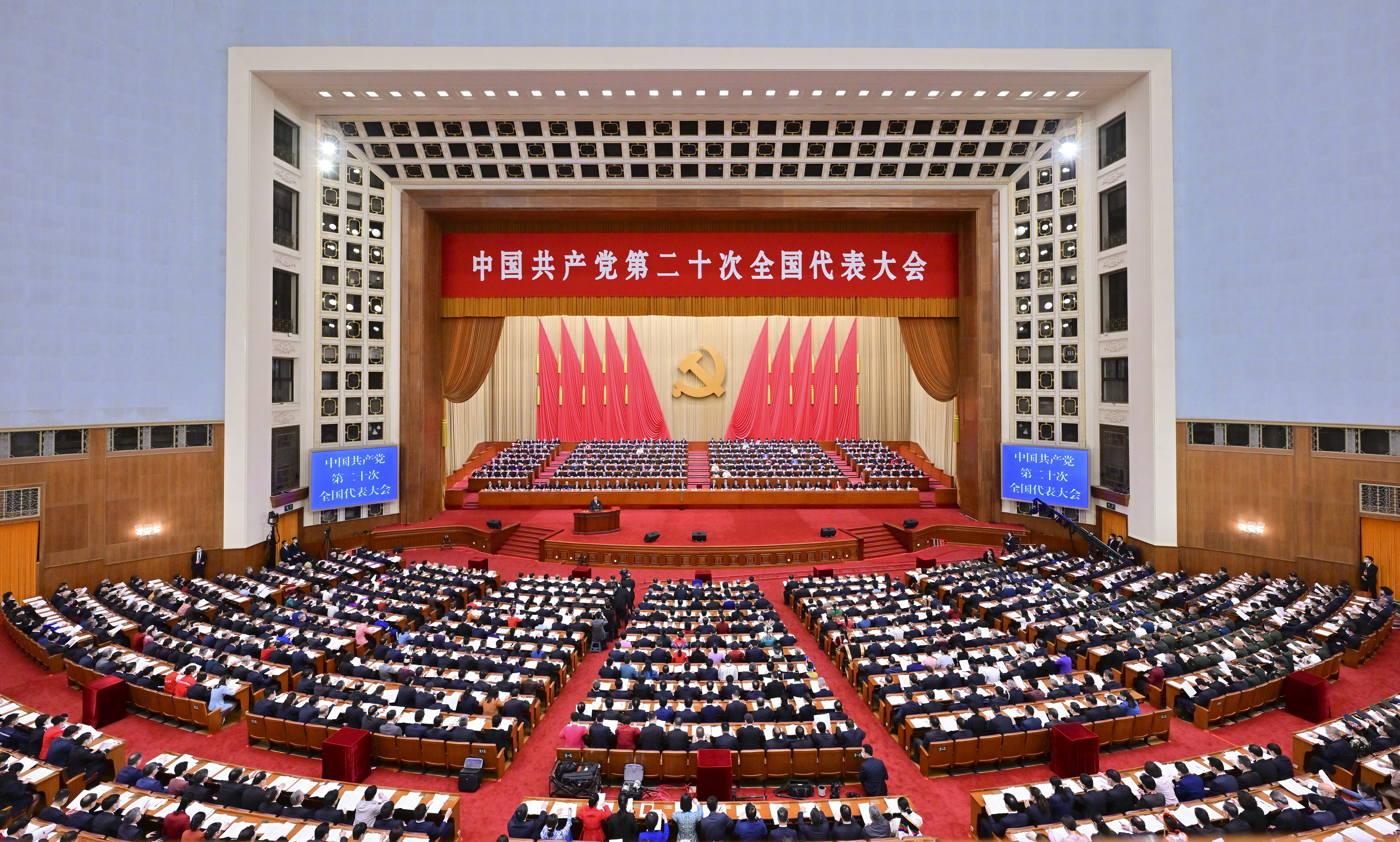 人民大会堂雄伟庄严,万人大礼堂气氛热烈。主席台上方悬挂着“中国共产党第二十次全国代表大会”的会标,后幕正中是镰刀和锤头组成的党徽,10面鲜艳的红旗分列两侧。二楼和三楼眺台上分别悬挂着“高举中国特色社会主义伟大旗帜,全面贯彻习近平新时代中国特色社会主义思想,弘扬伟大建党精神,为全面建设社会主义现代化国家、全面推进中华民族伟大复兴而团结奋斗!”“伟大、光荣、正确的中国共产党万岁!”的横幅。