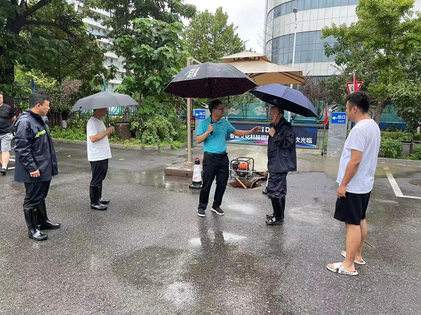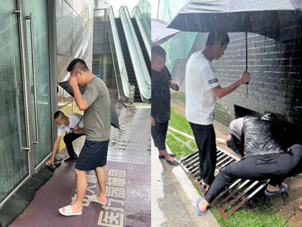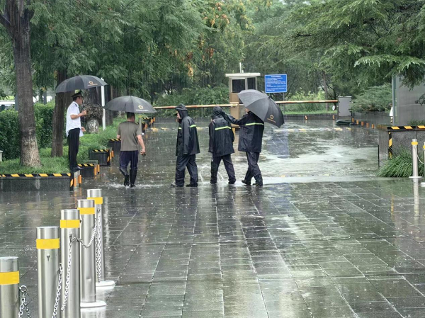 海淀四季科创中心加强巡查检查,24小时轮班值守,实时监测排水情况,及时清理堵塞排水口的杂物,设置警示隔离标志、挡水板、防汛沙袋等防水设施,及时排查消除安全隐患。