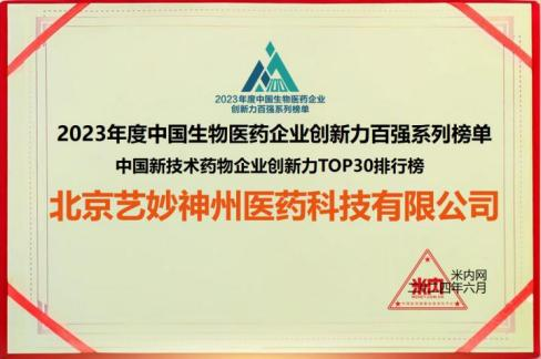 6月25日,北京艺妙神州医药科技有限公司(以下简称“艺妙神州”)凭借在中国基因细胞药物领域的卓越成就与持续创新能力自2020年以来第4次荣登2023度“中国新技术药物企业创新力TOP30排行榜”。