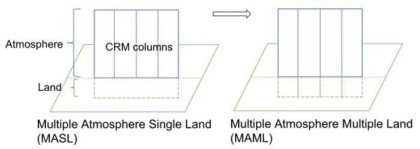 网格陆气耦合模拟的简单示意图。左图是在大气环流粗网格上进行陆气动量、热量和水汽交换,右图是新建的次网格陆气交换显式方案