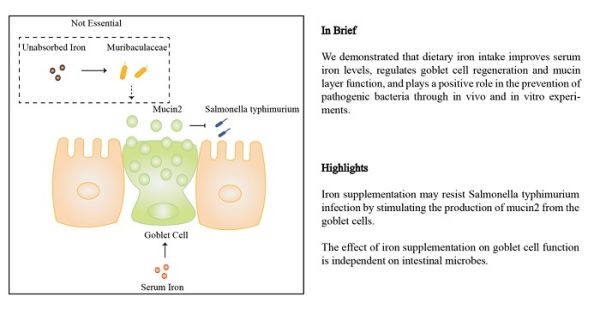 该工作为了评估足够的膳食铁摄入是否有助于抵御病原性细菌感染,给小鼠饲喂缺铁(2 mg Fe/ kg饲料)、铁充足(35 mg Fe/ kg饲料)或铁富集饲料(350 mg Fe/ kg饲料)12周,进一步将鼠伤寒沙门氏菌以灌胃方式感染小鼠。研究表明,膳食铁的摄入量可改善肠道黏液层的功能,并减缓鼠伤寒沙门氏菌的入侵。小鼠的血清铁浓度与杯状细胞数量及黏蛋白表达呈正相关。肠道中未吸收的铁可影响肠道微生物群的组成,且拟杆菌Muribaculace丰度与黏蛋白表达呈正相关。然而,抗生素处理小鼠的结果表明,膳食铁调节黏蛋白层功能不是微生物依赖性的。此外,体外研究显示,微量元素铁可以直接诱导回肠和结肠类器官中杯状细胞黏蛋白的表达。由此可见,膳食铁摄入可提高血清铁水平,调节杯状细胞增殖和黏蛋白层功能,对病原菌的入侵起到积极的防御作用。