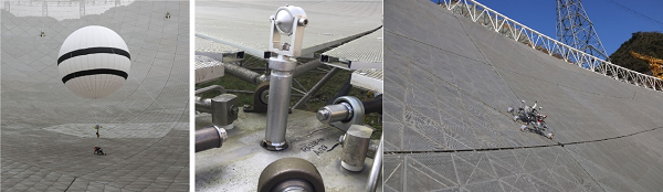 (左)FAST反射面上的微重力蜘蛛人。(中)FAST反射面上的激光靶标。(右)机器人在FAST反射面上进行测试