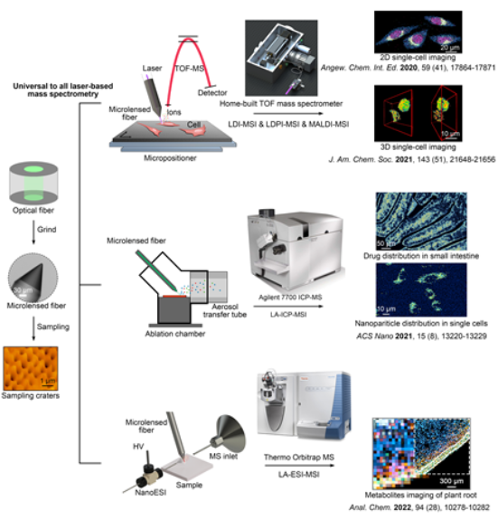 厦门大学化学化工学院杭纬教授课题组在2020年首次研发出了基于微透镜光纤的激光采样技术。近日,该课题组与斯坦福大学Richard Zare教授课题组合作,通过将微透镜光纤与商品化的ICP-MS相结合,课题组将LA-ICP-MS的空间分辨率提高至400 nm,相比于现有的技术提高了至少一个数量级,并进行了单细胞和小鼠小肠组织的成像分析。通过引入157 nm的后电离激光和基于嵌入式均匀圆形聚苯乙烯微球的三维定位方法,微透镜光纤带来的高空间分辨能力可用于准确重构还原药物在单细胞内的三维分布,空间分辨率可达500 nm。斯坦福大学的Richard N. Zare课题组将微透镜光纤与商品化仪器平台相结合,将现有的LA-ESI-MS成像分辨率提高了近一个数量级。