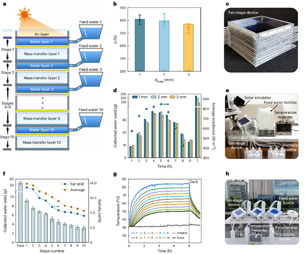 课题组明确了影响系统热性能的三个关键参数:顶部空气层厚度、水层厚度以及传质层厚度,并建立了一套理论模型,以能量转化效率为目标来优化结构参数。实验结果表明,单级蒸馏装置在常规3.5 wt%盐水环境下实现了60.6 %的太阳能到水的转化效率,并在21 wt%浓盐水环境下以47.4 %的效率可持续地蒸馏。具有10级水层回热结构的装置在常规3.5 wt%盐水环境下取得了354 %的高效率,并在每一级水层中都成功实现了抗盐功能。