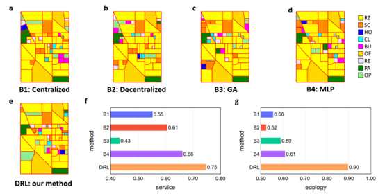 团队的模型规划方案与已有算法性能对比(a-e)不同算法的规划方案:(a)中心化启发式方法,(b)去中心化启发式方法,(c)遗传算法,(d)多层感知机强化学习算法,(e)所提方法。(f-g)15分钟城市性能指标对比:(f)服务指标,(g)生态指标
