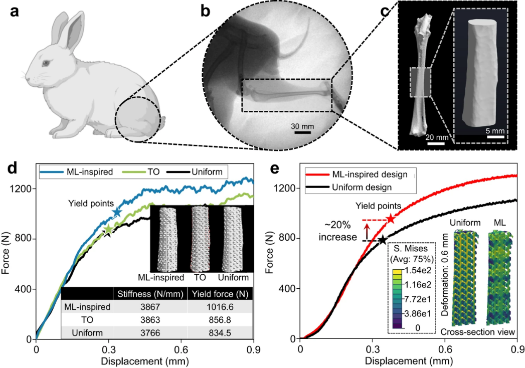 研究团队成功地将这种方法应用于钛合金和可降解锌金属骨缺损修复多孔植入物的优化设计和3D打印。其生成的多孔植入物在快速匹配骨骼解剖形态和弹性模量的同时,还能保持良好的孔隙连通性和可制造性,展现出比均质结构和拓扑优化结构更高的屈服强度和更均匀的应力分布。