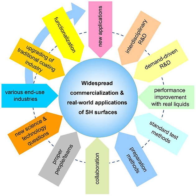 近日,该课题组发表展望文章,介绍了对超疏水表面发展现状的调查结果,包括基础研究、专利申请和商业化情况。基于前期调查和多年研发基础,探讨了超疏水表面商业化和广泛实际应用的挑战和策略——超疏水表面的综合性能、制备方法和应用场景是其商业化和广泛实际应用的主要制约因素,在设计制备超疏水表面时,应同时兼顾、解决这些挑战。为此,课题组提供了可行策略。文章重点介绍了超疏水表面综合性能的标准测试方法,展望发展前景。课题组期望通过文中建议的策略及学术界和工业界的合作,于2035年左右实现超疏水表面的广泛商业化和实际应用。