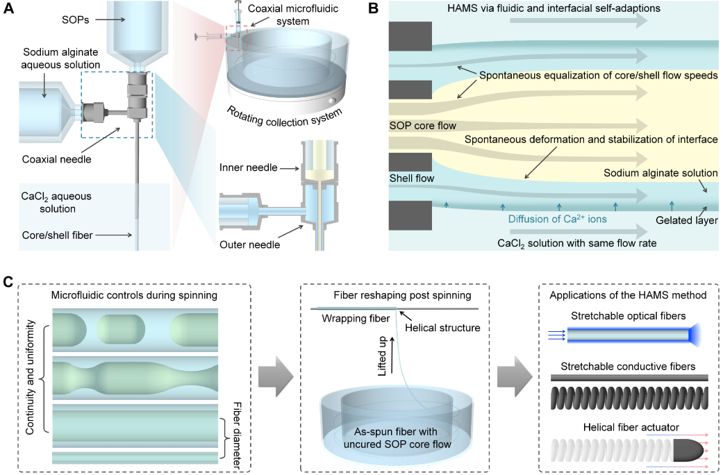 对此,西安交通大学生命科学与技术学院仿生工程与生物力学研究所与海南大学生物医学工程学院赵国旭副教授和王东教授开展多学科交叉合作,他们开发了一种水凝胶辅助的同轴微流控纺丝方法,能够量产纤维形态优异的可拉伸纤维,普适于一大类不可纺聚合物。