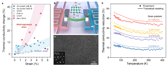为此,北京大学杨林、高鹏、杜进隆与西安交通大学岳圣瀛等科学家合作,通过实验探究出非均匀应力对导热调控的新策略。研究团队通过在自制的悬空微器件上弯曲单个硅纳米带诱发非均匀应变场,利用具有亚纳米分辨率的基于扫描透射电子显微镜的电子能量损失谱技术表征了局域晶格振动谱。其研究揭示了非均匀应变对固体导热的调制机理,还为基于应变工程的功能性器件的创新设计提供了重要思路。例如,基于应变梯度引起的晶格热导率降低,与载流子迁移率增强之间的协同作用,为开发高性能的热电转换器件提供一种新策略。此外,基于非均匀应变调制热导率可实现功能性热开关器件,用于动态控制热通量。