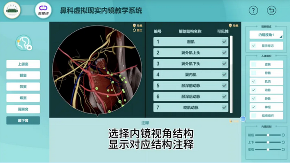 鼻窦-颅底区域是人体解剖最复杂的区域之一,学习困难大、曲线长。据称,该系统在业界首次融合了三维解剖教学和VR仿真教学功能,如同“超级侦探”。它兼具三维解剖结构教学、三维手术导航教学和内镜模拟探查教学功能。