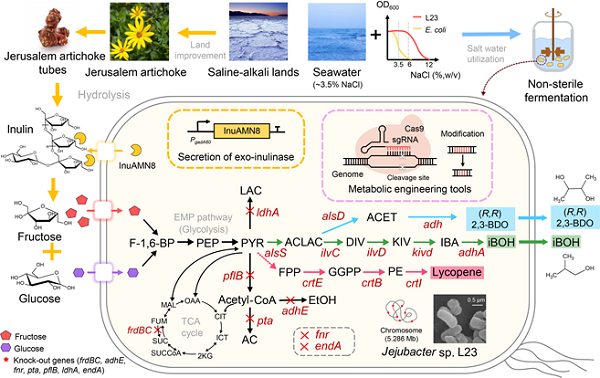该团队首次开发了一种类似大肠杆菌的、易于工程改造的新型耐盐微生物平台——济州杆菌 Jejubacter sp. L23。他们通过生物合成途径和宿主代谢途径等多方面工程改造,实现了以济州杆菌为宿主,利用非粮生物质菊粉为底物,非灭菌发酵生产异丁醇、( R , R )-2,3-丁二醇和番茄红素等大宗化学品。依托该技术,在3L发酵罐中,L23R7菌株利用菊粉进行非灭菌发酵生产异丁醇的产量高达41.0±1.2 g/L,是摇瓶发酵实验的5.5倍。