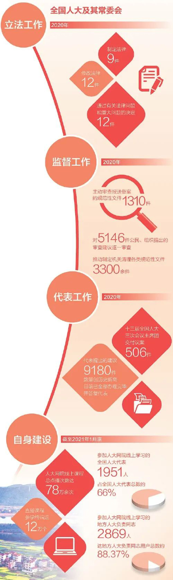过去一年来,全国人大常委会坚持和完善各项学习制度,为做好人大工作筑牢思想基础、提高能力水平。2020年7月1日,全国人大网络学院正式上线,通过网络直播和录播专题课程方式,一方面满足了全国人大代表、地方人大负责同志更好履职尽责的学习培训要求,另一方面大大加强全国人大机关干部加强理论武装的实际需要。截至2021年1月底,全国人大网络学院课程总点播次数达78万余次,直播课程参学终端近12万个。