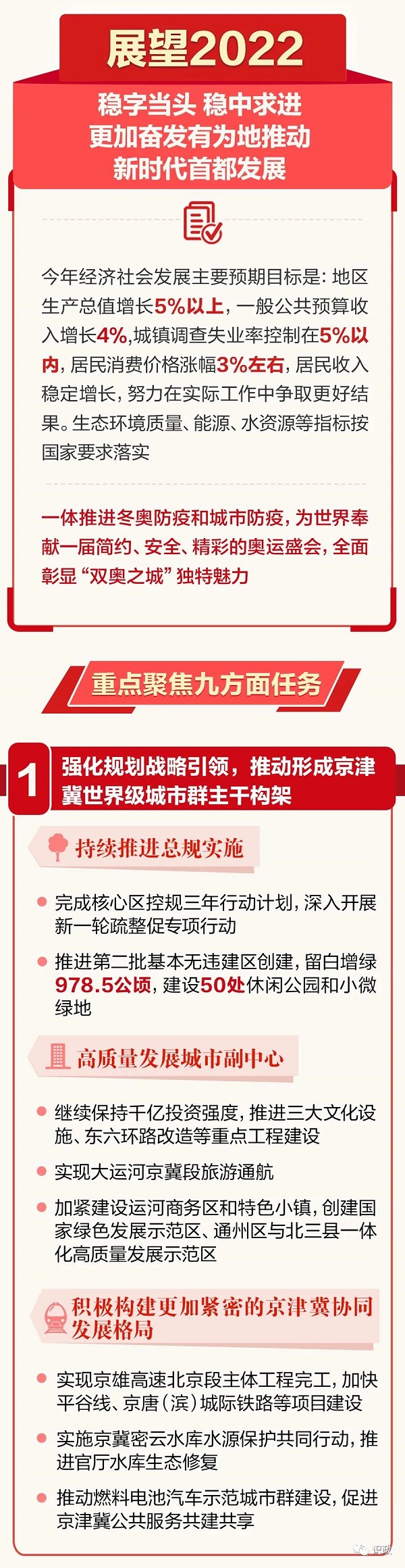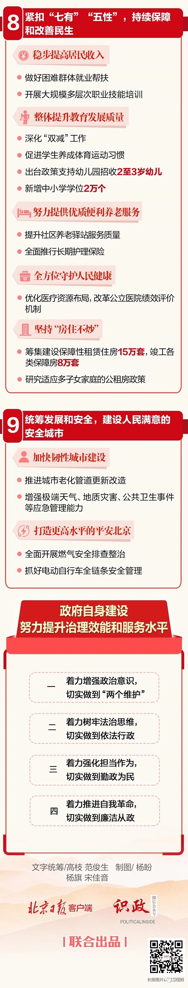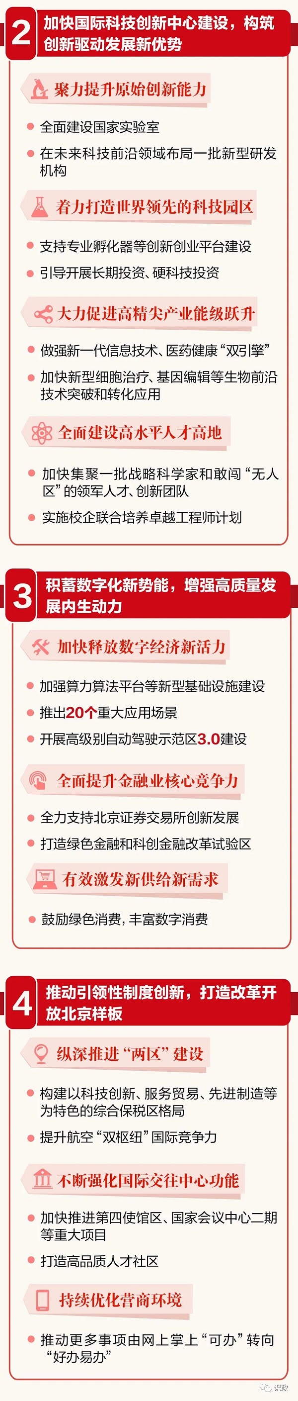 继续保持城市副中心千亿投资强度、在未来科技前沿领域布局一批新型研发机构、加快集聚一批战略科学家和敢闯“无人区”的领军人才、开展高级别自动驾驶示范区3.0建设、打造“京通”“京办”“京智”三个智慧终端、出台政策支持幼儿园招收2至3岁幼儿......一大批增强高质量发展内生动力、惠及市民群众的政策措施落点落图。
