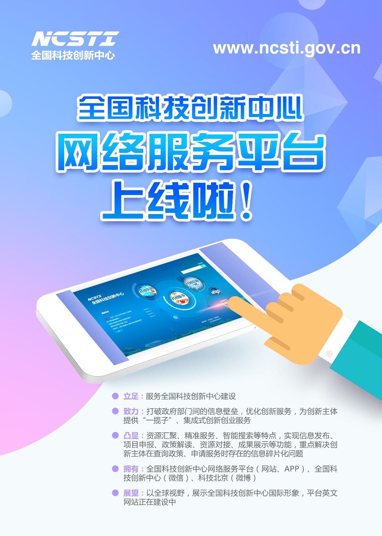 全国科技创新中心网络服务平台立足服务全国科技创新中心建设,顺应新时代发展要求,借助新一代信息技术和移动互联网,汇聚创新资源,破解现有创新服务平台的局限性,打破政府部门间的信息壁垒,优化创新服务,实现信息发布、项目申报、政策解读、资源对接、成果展示、互动交流等功能,为各类创新主体、科技中介、社会公众等提供有针对性的精细化、全流程服务,促进协同创新、资源共享、跨界融合、要素整合,打造具有权威性和影响力、综合化和集成式的创新网络服务平台。