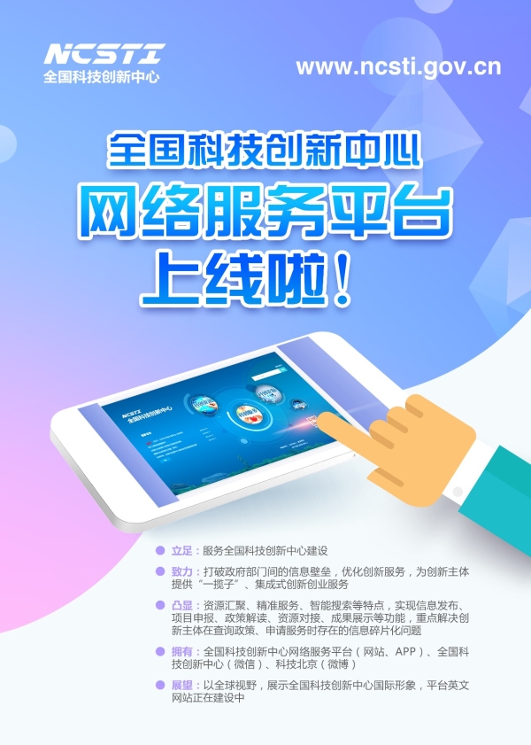 此次上线的全国科技创新中心网络服务平台PC端中文网站与手机客户端,和现有的“全国科技创新中心”微信公众号、“科技北京”微博共同构成新媒体宣传矩阵,为创新主体提供全方位的科创资讯和服务。