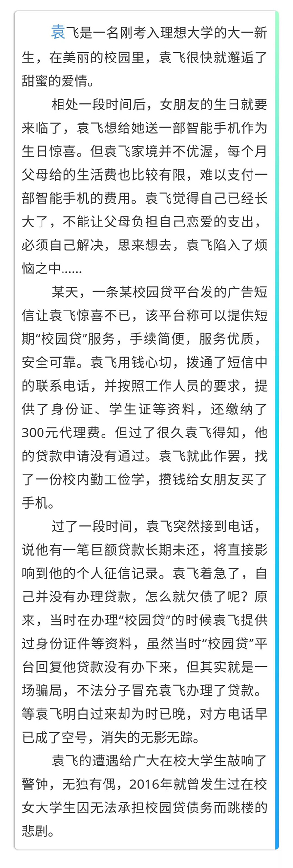 三是要通过正规金融机构办理金融业务。在校学生要掌握基本的理财技能,学会使用各类金融工具,如确有正当消费需求,应通过正规金融机构办理相关金融业务,切不可轻信不法分子的诈骗诱饵,让非法“校园贷”钻了空子。