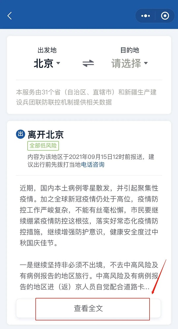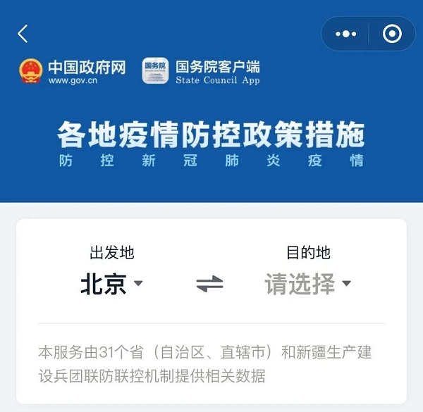 “各地疫情防控政策措施”查询服务,该服务由31个省(自治区、直辖市)和新疆生产建设兵团联防联控机制提供相关数据。了解出发地和目的地的最新防疫政策措施,只要1分钟!