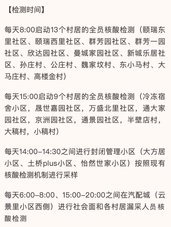 根据北京市疫情防控工作领导小组工作部署,结合北京市及房山区疫情发展态势,房山区决定于5月7日和8日组织开展两轮区域核酸筛查。