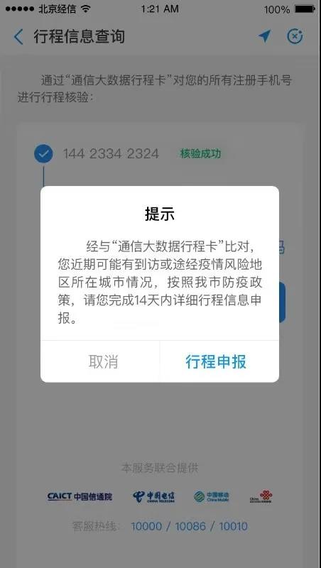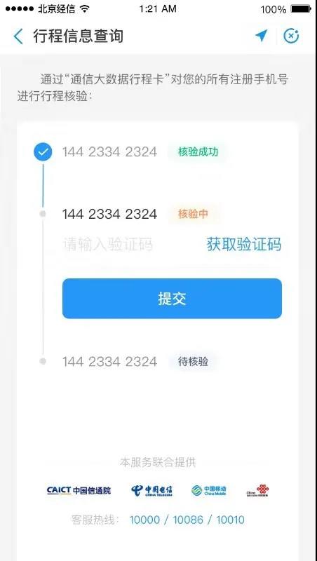 此时系统将通过“通信大数据行程卡”对您的个人中心所有手机号码—核验,您仅需输入获取的手机验证码点击“提交”即可。