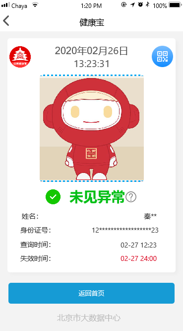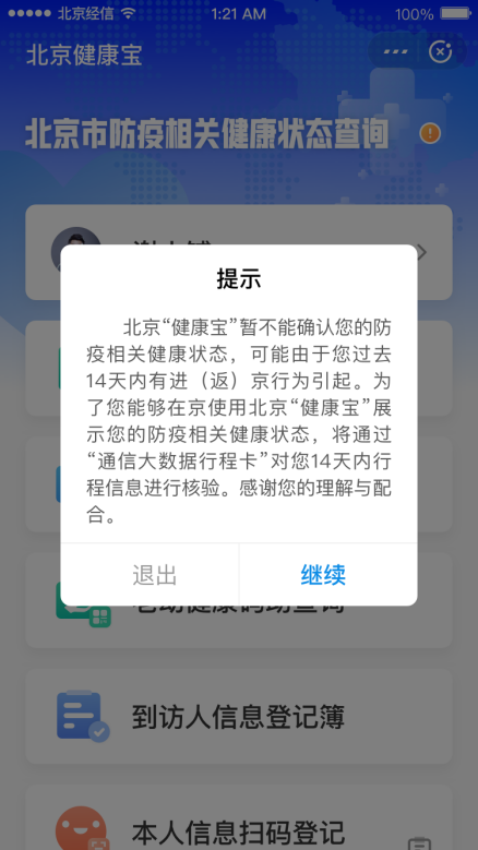 若您所到访的地区中不包括中高风险地区,且无其他异常情况——您的健康状态将转为未见异常,可正常使用北京“健康宝”所提供的各项功能。