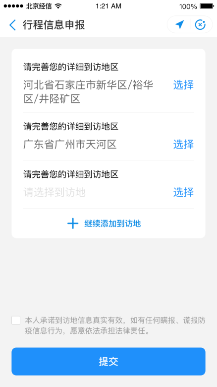 在中高风险地区列表中,继续补充填写本人近14天详细到访地区(含北京市),承诺所填信息真实有效后点击“提交”。(仅需在“健康宝”提供的中高风险城市列表中选择到访地区,未包含在列表中的城市不需填写)