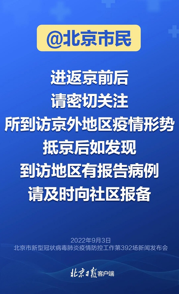 切实履行个人防疫责任,坚持不去7日内出现本土疫情的县(市、区、旗),进返京人员尽量采取电话等无接触方式主动向社区、单位、宾馆等报告,遵守各项防疫规定。抵京24小时内进行一次核酸检测,抵京24小时后、72小时内再次进行核酸检测,抵京7日内不聚餐、不聚会、不前往人员密集场所,核酸检测阴性结果未出之前减少外出,必须外出时要做好个人防护。